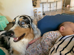 While not an Aussie Shepherd, Gracie is a Shepherd of sorts and what we call an Alice Springs Special. Gracie plays an important role as top dog in the pack. She is a good role model, gentle with puppies and helps them understand the rules of the house. Gracie is my Obedience and Agility Star and enjoys chasing balls, going for runs, bike rides and playing with her human siblings.